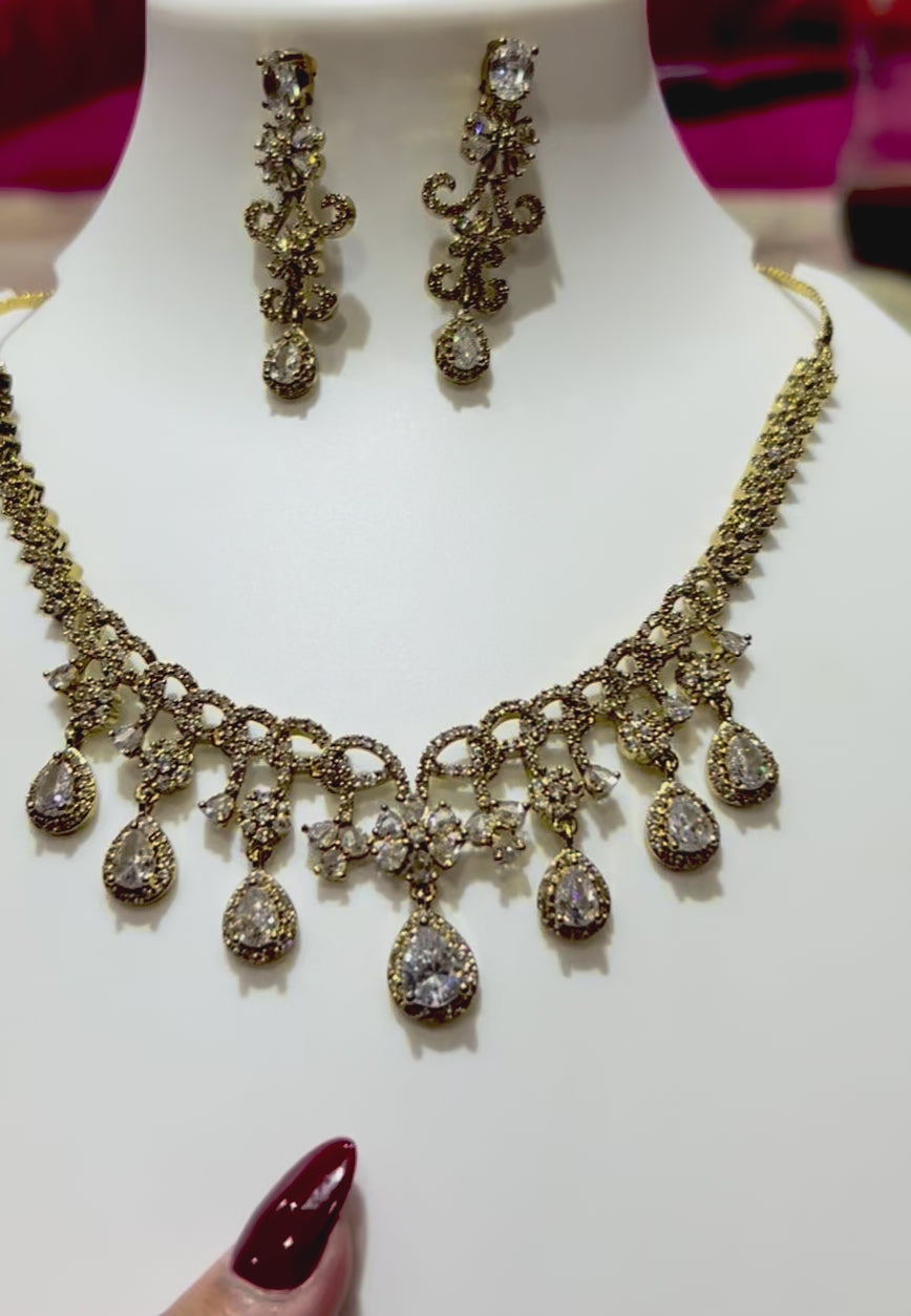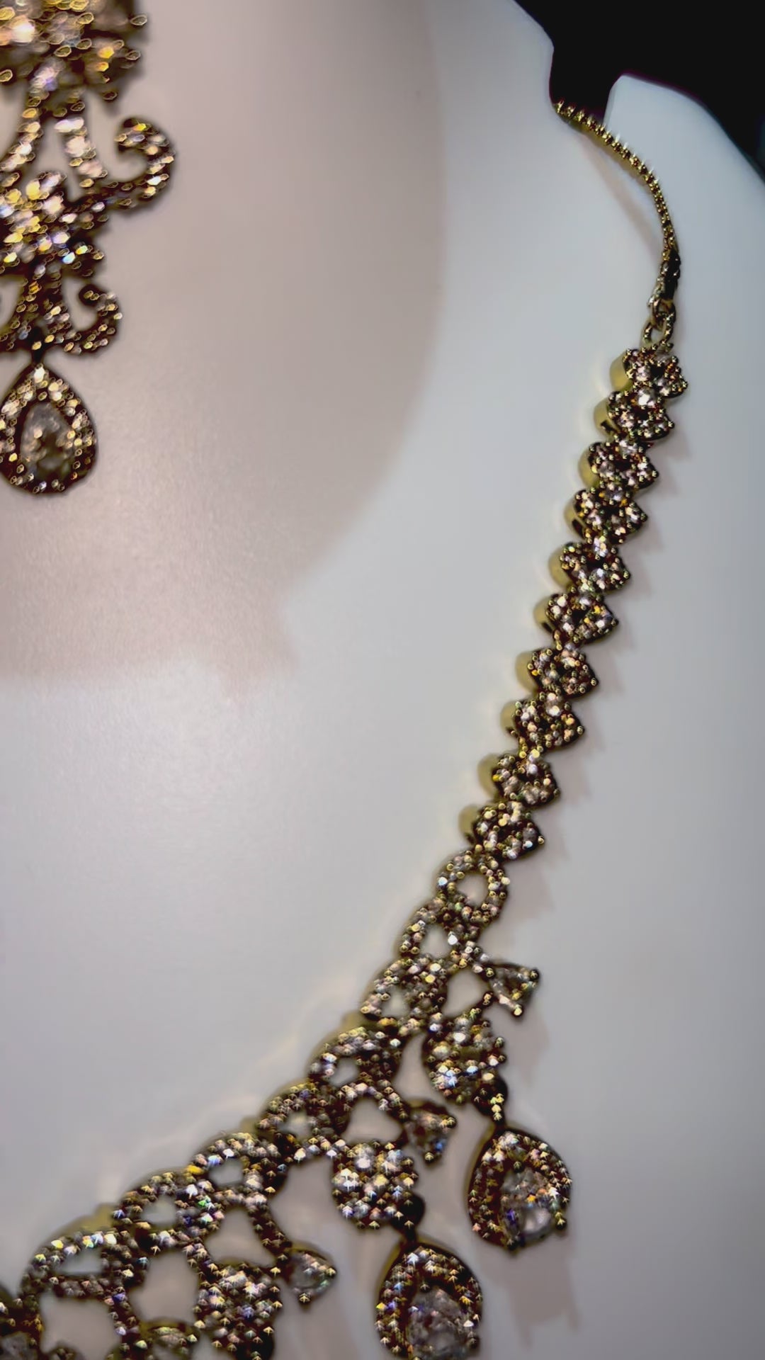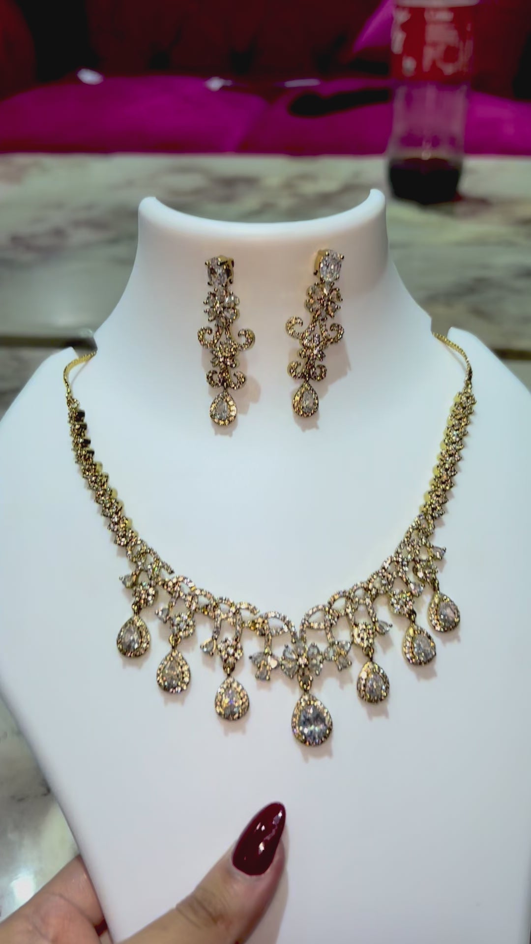 Elevate your traditional look with this Mehendi American Diamond set, featuring intricately designed tops paired with a matching necklace. Crafted to complement mehendi occasions, the set combines classic motifs with sparkling American diamonds, adding a refined elegance to your ensemble. Perfect for enhancing your festive attire with expert craftsmanship and timeless charm.