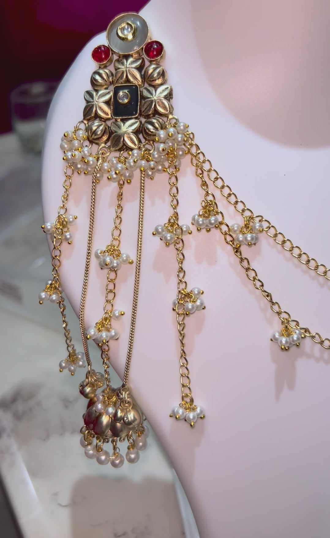 Raqs-e-Noor is a meticulously crafted passa jhoomar, ideal for enhancing your festive party ensemble. Its detailed design and balanced structure ensure it complements traditional attire while providing a sophisticated touch. Perfectly suited for celebrations, this piece combines cultural heritage with refined elegance, making it a valuable addition to your festive jewelry collection.
